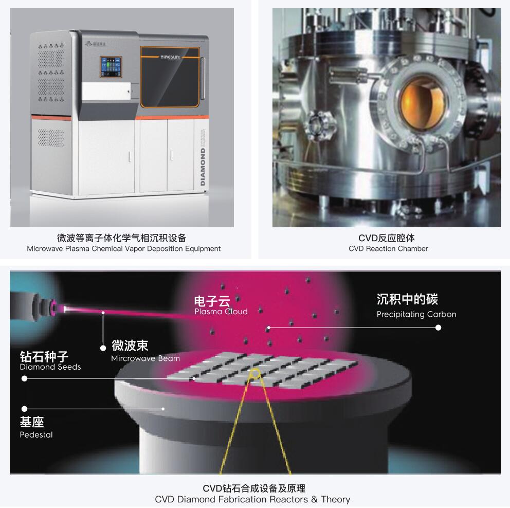 微波等離子體化學氣相沉積法(MPCVD)是指在真空腔體中通入高純度的氫氣(H2)和甲烷氣體(CH4),氫氣在微波的作用下產生等離子體火球,甲烷氣體在等離子作用下打開化學鍵變成了游離的碳原子(C)和氫原子(H),游離的碳原子在強大能量的等離子作用下逐步會沉積在腔體底部的金剛石種子上,使種子逐步長厚最終形成與天然金剛石結構成分完全一樣的CVD金剛石。